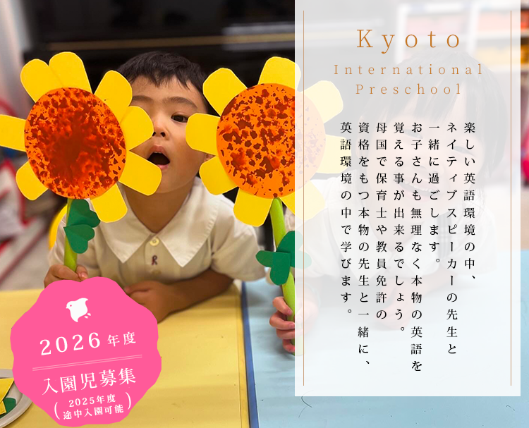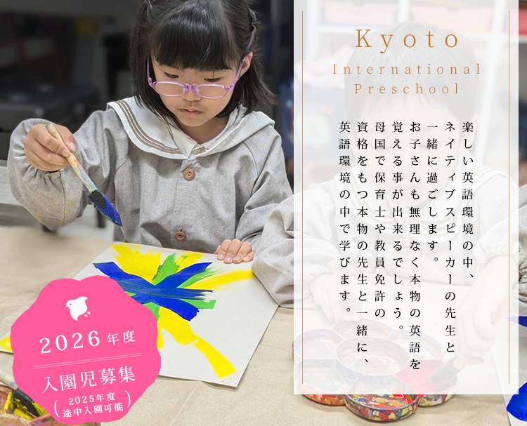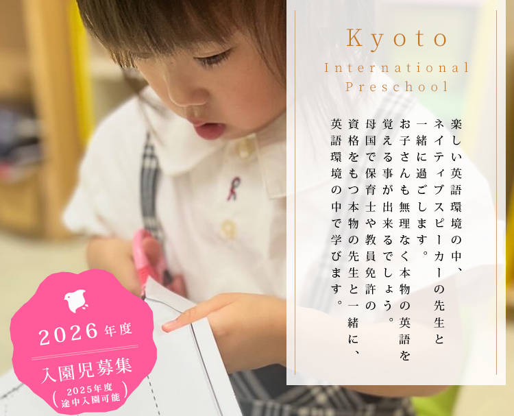 また、Kyoto International Preschoolでは、社会性を身につけられるようマナーや躾にも力を入れて教育を行っています。日本人として自信を持ち、世界の舞台で活躍していける子ども達、そこまでの過程に到達するまでに、 状況に応じて柔軟に考えることのできる力、自らの言葉で発信する力、様々な選択肢の中から自分で選択、選別できる力・自己他者共に肯定でき、受け入れられる力を育てていきたいと思っております。